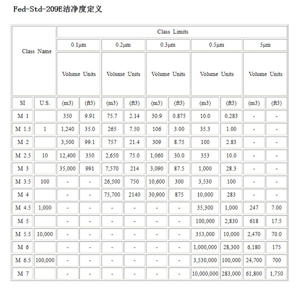 10級在0.2μm(塵粒尺寸在0.2μm或更大下,密度不大于75顆/立方英尺),1級在0.1μm(塵粒尺寸在0.1μm或更大下,密度不大于35顆/立方英尺)。